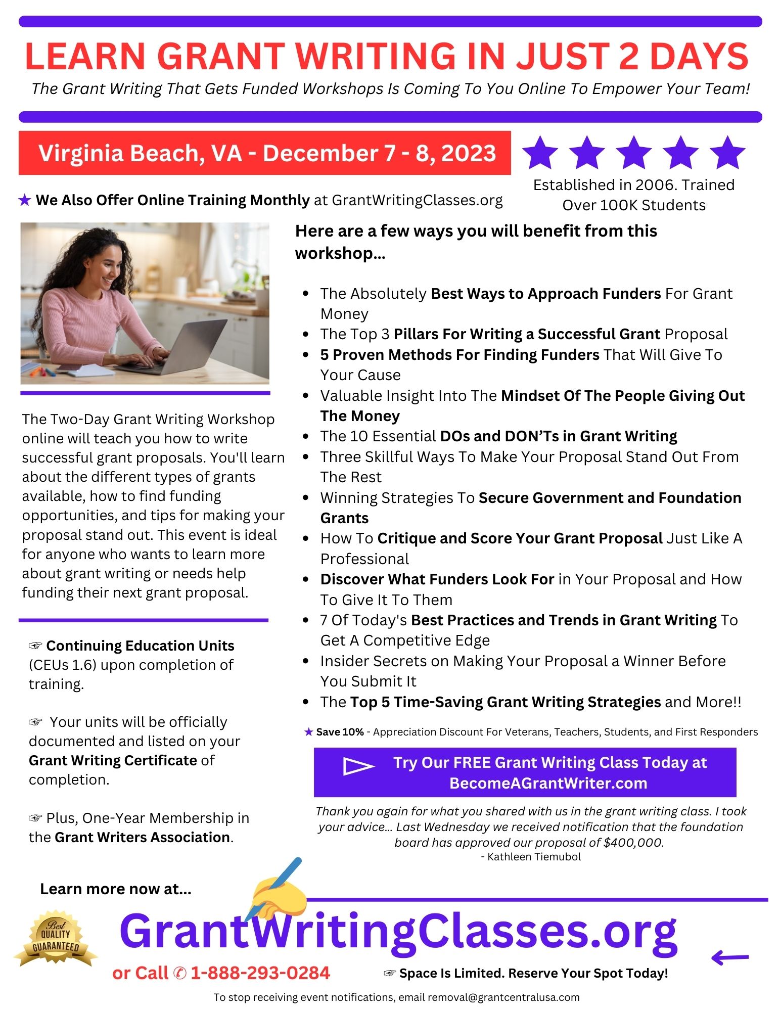 The Two-Day Grant Writing Classes In Virginia Beach, Virginia, will teach you how to write successful grant proposals. You'll learn about the different types of grants available, how to find funding opportunities, and tips for making your proposal stand out. This event is ideal for anyone who wants to learn more about grant writing or needs help funding their next grant proposal.