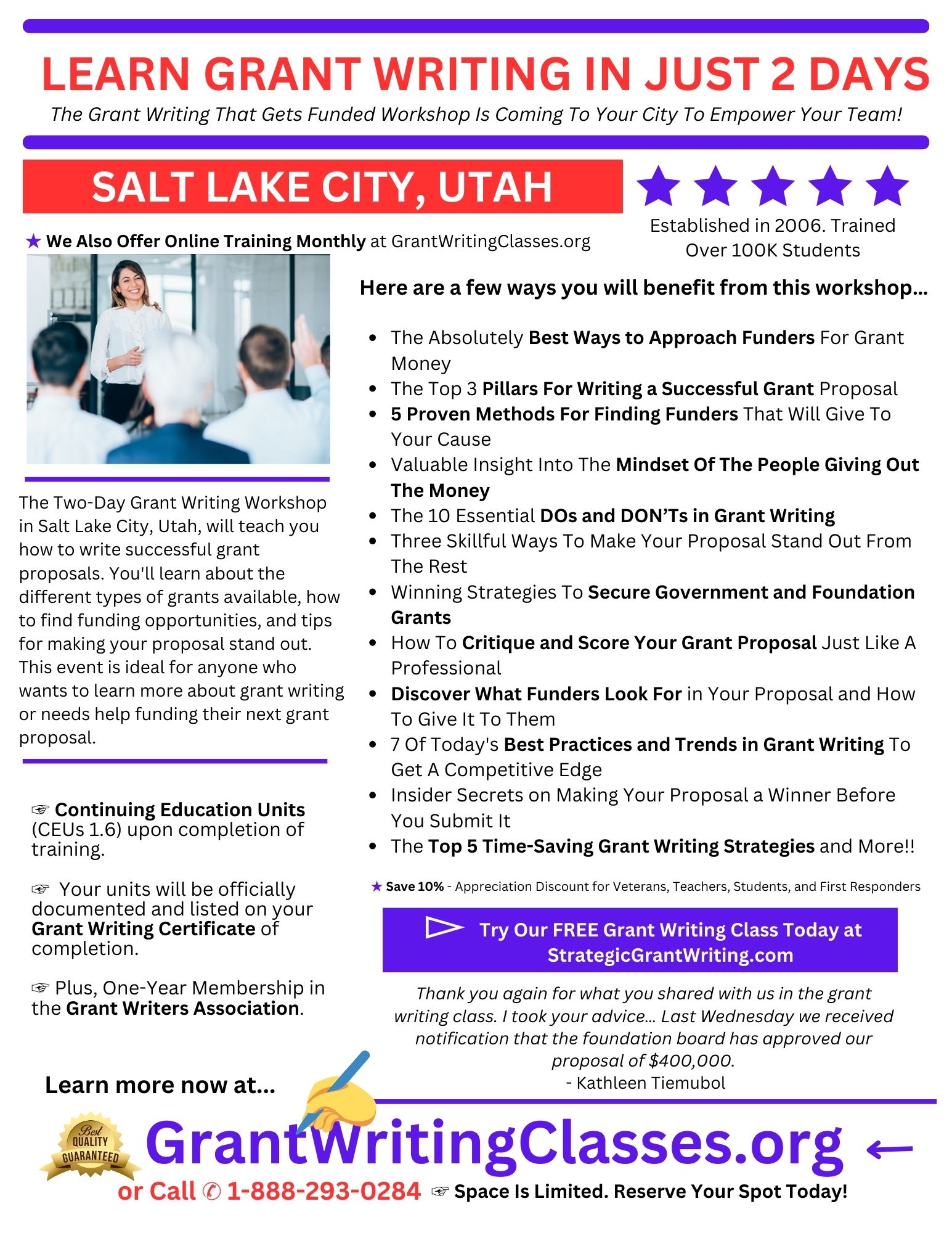 The Two-Day Grant Writing Classes In Salt Lake City, Utah, will teach you how to write successful grant proposals. You'll learn about the different types of grants available, how to find funding opportunities, and tips for making your proposal stand out. This event is ideal for anyone who wants to learn more about grant writing or needs help funding their next grant proposal.