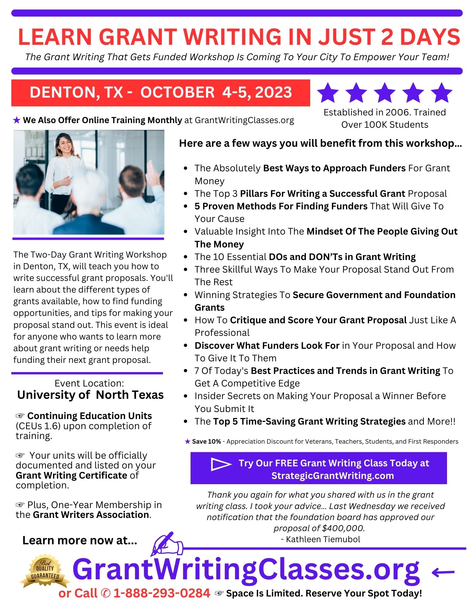 The Two-Day Grant Writing Classes In Denton, Texas, will teach you how to write successful grant proposals. You'll learn about the different types of grants available, how to find funding opportunities, and tips for making your proposal stand out. This event is ideal for anyone who wants to learn more about grant writing or needs help funding their next grant proposal.